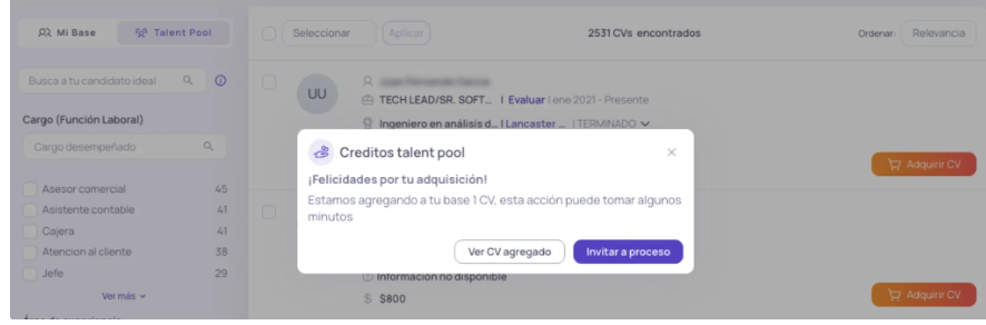 - Cuando compro varios CVs ahora me permite invitar a estos mismos candidatos a los procesos que tiene activos la empresa