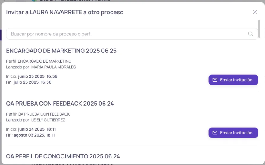 - Si selecciono algún proceso para invitar a los candidatos, todos los candidatos que haya adquirido serán invitados al proceso seleccionado