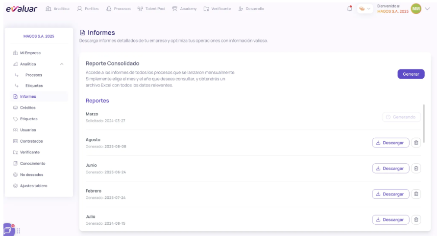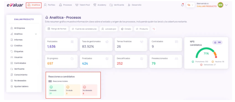 Proporciona una visión detallada del desempeño de los procesos de evaluación en la plataforma. A través de métricas e informes, las empresas pueden analizar la efectividad de sus pruebas y optimizar la selección de talento.