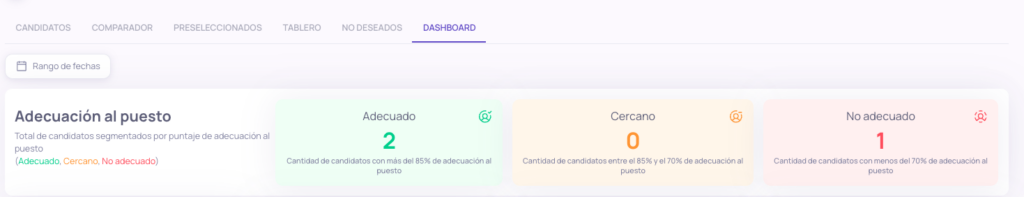 Adecuación al puesto: Encontrarás un resumen de la cantidad de candidatos que se encuentran dentro de los rangos de adecuación al puesto: