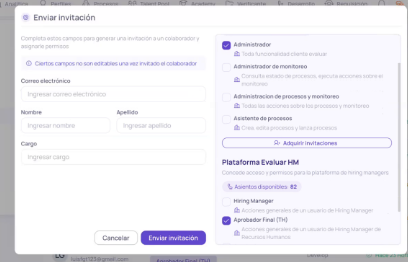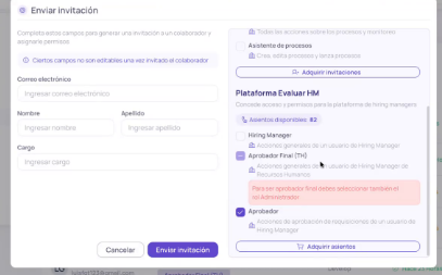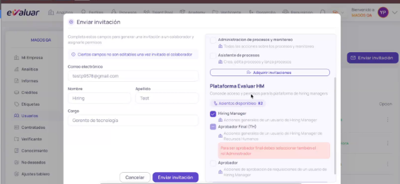 - Una vez guardado, el usuario recibirá automáticamente una invitación en su correo electrónico para acceder al módulo de Hiring Manager.