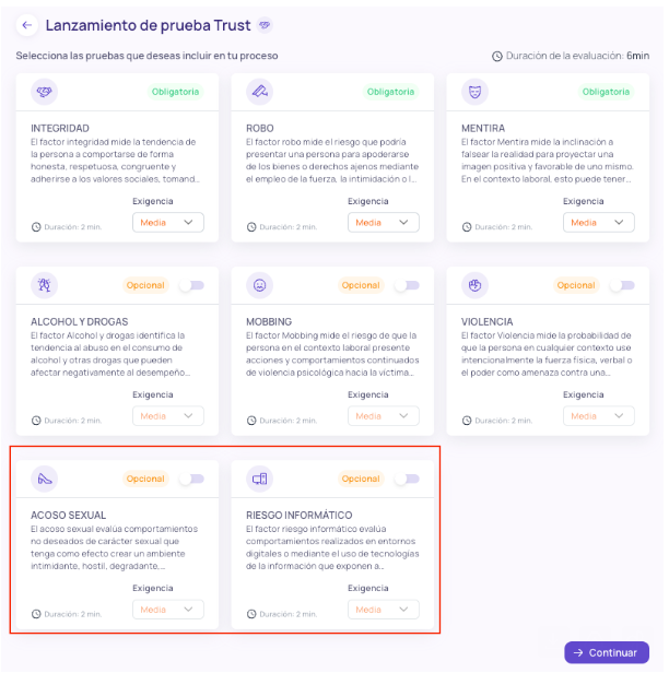 - Configura los factores, el nivel de exigencia (Alto, Medio, Bajo) y haz clic en “Continuar”.