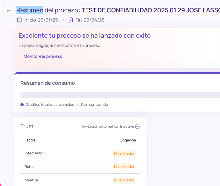 Esta sección proporciona una visión general del estado del proceso lanzado, las fuentes de viralización, integraciones y resumen de como el proceso ha sido configurado, adicional a esto podrás agregar a los candidatos que serán evaluados y deseas que reciban la invitación de tu proceso