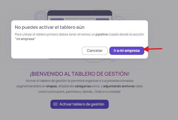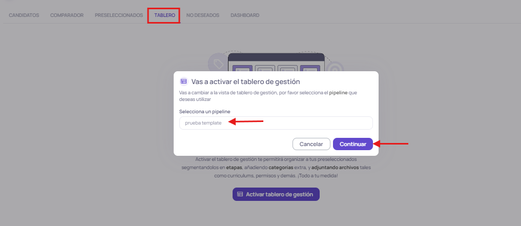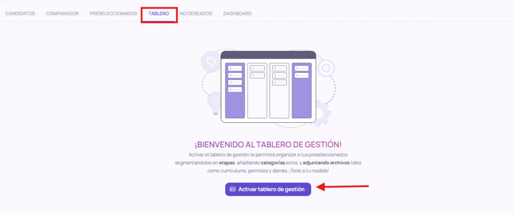 Para activar el tablero, ve a la sección Tablero y haz clic en Activar tablero de gestión.