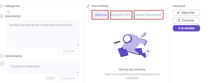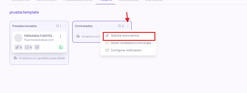 - Se puede configurar una etapa en el tablero para manejar la gestión documental de los candidatos que participan en un proceso