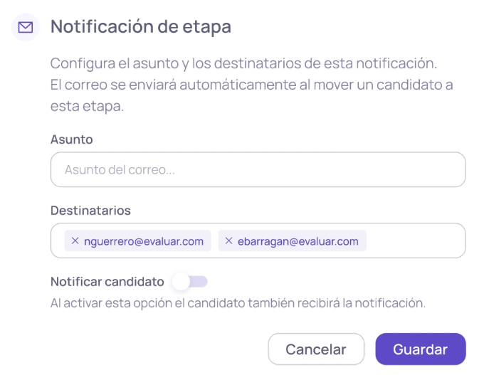- Se deberá agregar el nombre del template y la lista de correos a los que se debe enviar la notificación cada vez que un candidato sea colocado en dicha lista.