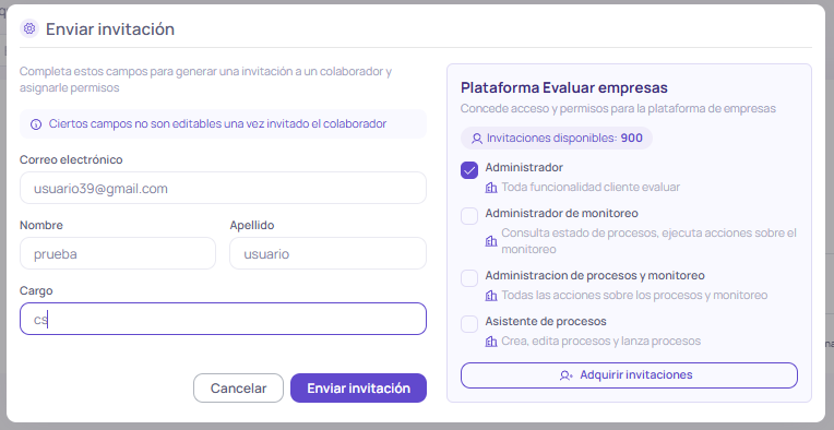 Importante: solo los usuarios con rol Administrador pueden crear y enviar invitaciones a nuevos usuarios.